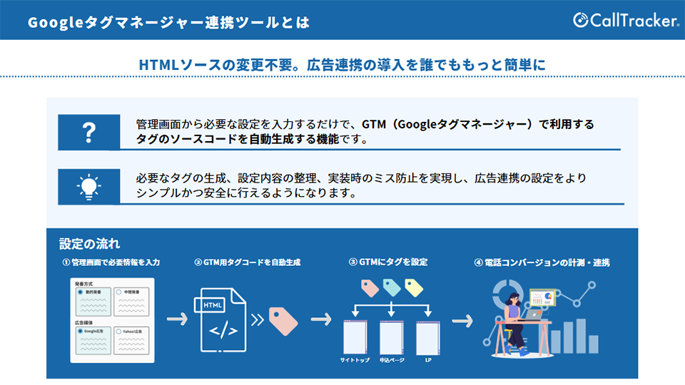 株式会社コムスクエア(本社:東京都中央区、代表取締役会長:上嶌 靖、以下 コムスクエア)は、提供するコールトラッキングサービス「CallTracker(コールトラッカー)」において、Googleタグマネージャー(Google Tag Manager)と連携し、Webサイト経由で発生した電話コンバージョン計測に必要なタグ情報を自動生成する「Googleタグマネージャー連携ツール」を新たに提供開始したことをお知らせいたします。